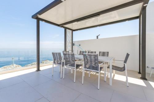 Questa villa presenta 8 camere da letto, 7 bagni, lenzuola, asciugamani, una TV a schermo piatto, una zona pranzo, una cucina con utensili e una terrazza con vista sul mare.