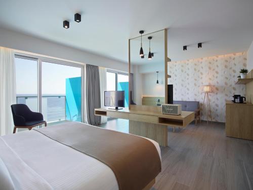 The hotel features sea views, a terrace and a 24-hour front desk. In-room facilities include a Wardrobe, a Flat-screen TV, a Safe Box, a Mini-Fridge, an Electric Kettle and a private bathroom. A Breakfast Buffet is served daily at the terrace and the indoor area of the main Restaurant. Free Wi-Fi is available throughout.