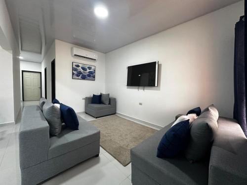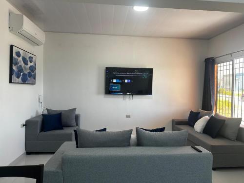Questa casa vacanze con aria condizionata comprende 3 camere da letto, un soggiorno, una cucina con utensili e 3 bagni. A disposizione troverete una TV a schermo piatto.