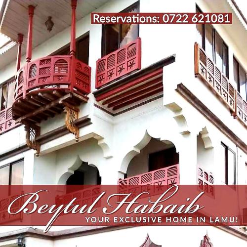 Dotato di un giardino, una sala comune e vista sul mare, Beytul Habaib è un alloggio ubicato a Lamu a 200 metri da Gallery Baraka. Dotata di il servizo in camera, questa struttura offre ai propri ospiti anche un’area giochi per bambini. L'alloggio propone una reception 24 ore su 24, transfer aeroportuali, una cucina in comune e il WiFi gratuito.