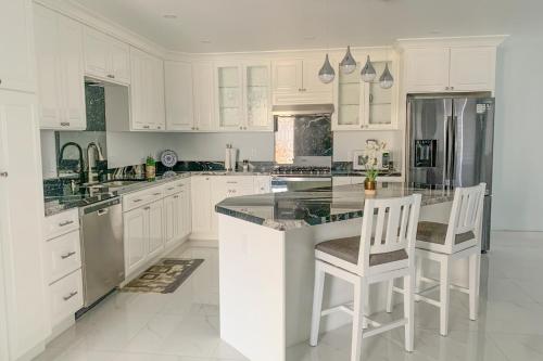 Questa casa vacanze dispone di 4 camere da letto, 5 bagni, lenzuola, asciugamani, una TV, una cucina con utensili e un balcone con la vista sul mare.