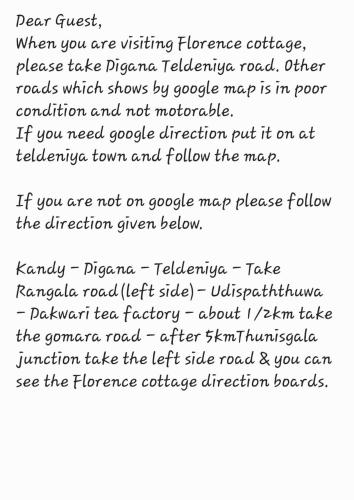 Tempio Sri Dalada Maligawa è a 39 km da Florence Cottage, mentre Museo di Kandy si trova a 39 km di distanza. Idroscalo della Diga di Victoria - Kandy si trova a 30 km dalla struttura.