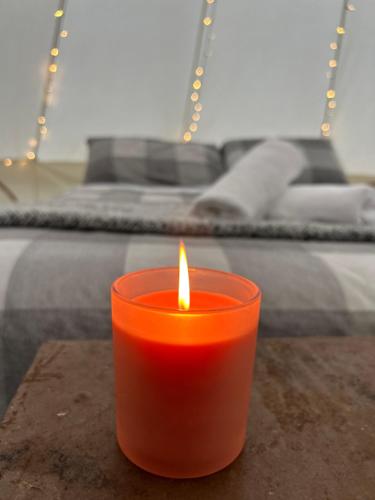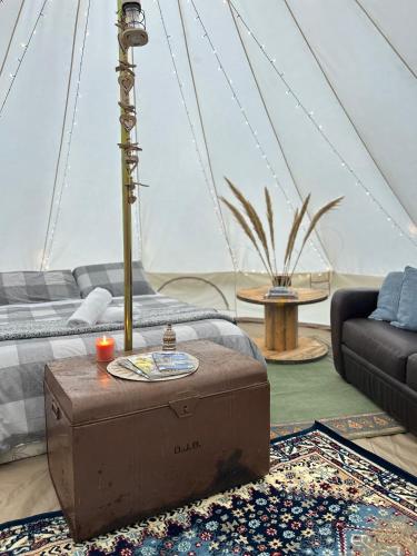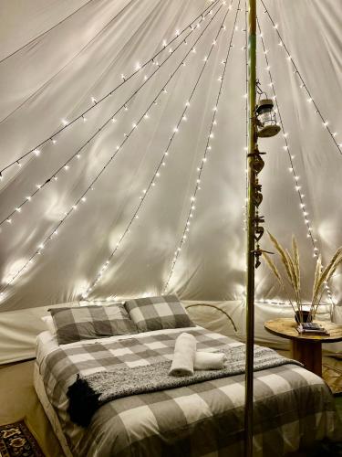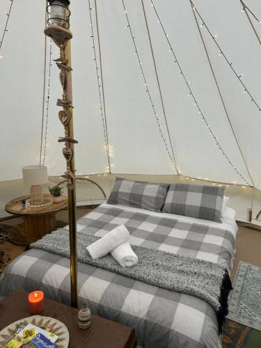 Håndklær og sengetøy finnes tilgjengelig i luksusteltet.