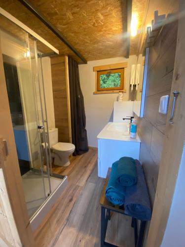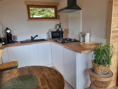 Denne hytta har 1 soverom, stue og et fullt utstyrt kjøkken med kjøleskap og mikrobølgeovn.