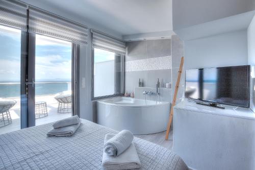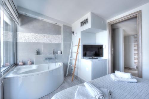 Villa Aelia har 3 soverom, 2 bad med dusj og boblebad, sittehjørne og kjøkken med kjøleskap. Håndklær og sengetøy finnes tilgjengelig i villaen.