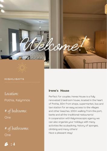I Kálymnos, 1,8 kilometer fra Gefira strand og 15 minutters gange fra Kalymnos havn, ligger Irene's house, et klimaanlegg overnattingssted med balkong og gratis WiFi.