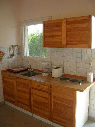NIKOS har 2 soverom med klimaanlegg og et fullt utstyrt kjøkken med kjøleskap. Håndklær og sengetøy finnes tilgjengelig i feriehuset.