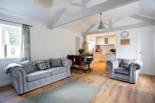 Thrush Nest Cottages - Wren Cottage sleeps 4, 2 bedrooms & Stable Cottage sleeps 2, 1 bedroom har terrasse, utsikt mot hagen, sittehjørne, TV (flatskjerm), kjøkken med kjøleskap og stekeovn og eget bad med dusj og hårføner. En mikrobølgeovn, kokeplater og brødrister finnes også tilgjengelig, i tillegg til vannkoker.