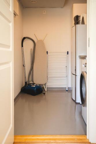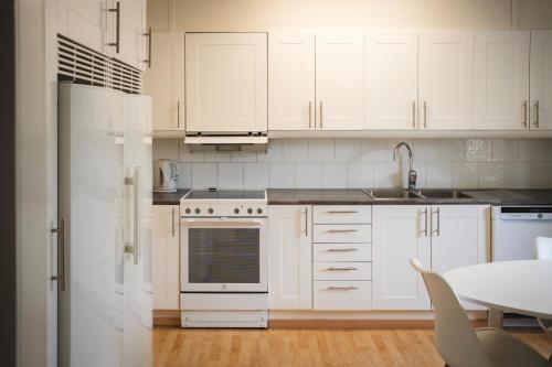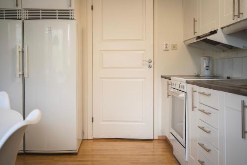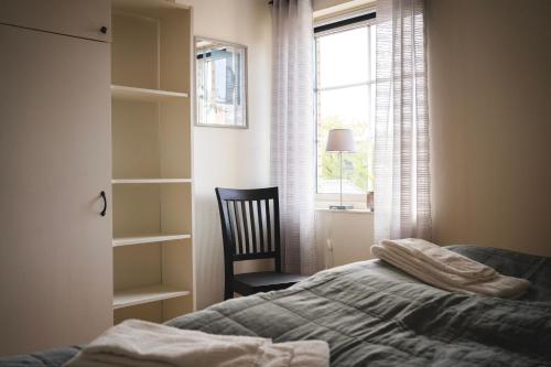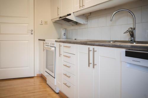 Rymligt radhus med trädgård & parkering har terrasse, utsikt mot hagen, sittehjørne, TV (flatskjerm), kjøkken med kjøleskap og oppvaskmaskin og eget bad med dusj.