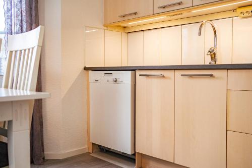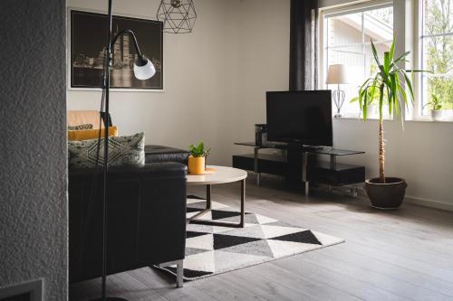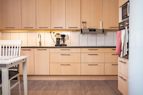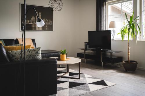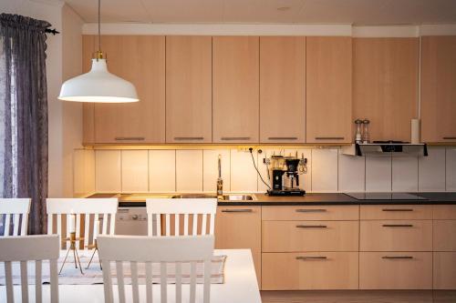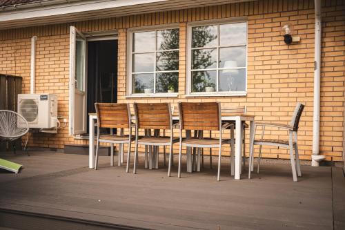 Rymligt radhus med trädgård & parkering har terrasse, utsikt mot hagen, sittehjørne, TV (flatskjerm), kjøkken med kjøleskap og oppvaskmaskin og eget bad med dusj.