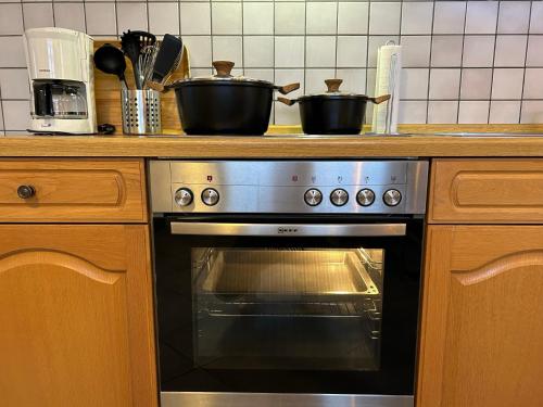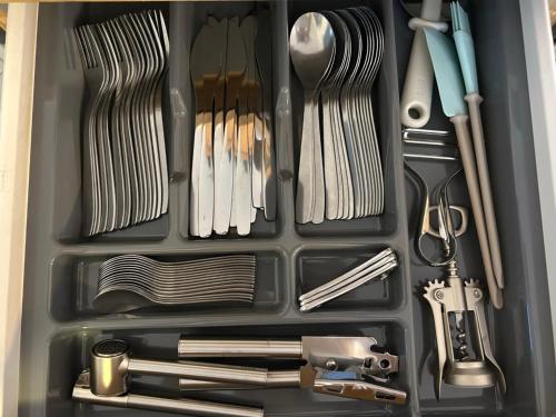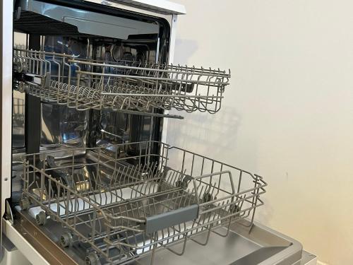 Et kjøleskap, en oppvaskmaskin og stekeovn finnes også tilgjengelig, i tillegg til kaffemaskin og vannkoker.