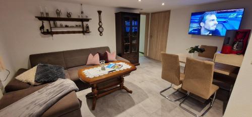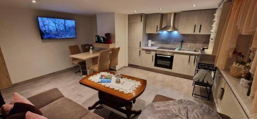 Ferienwohnung Heike Rinno har 2 soverom, 1 bad med hårføner, stue og kjøkken med kjøleskap. Håndklær og sengetøy finnes tilgjengelig i leiligheten.
