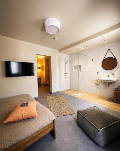 Individually furnished rooms with flat-screen TVs are provided at the Hotel-Bistro-Europa. Rooms are decorated in warm colours and have rustic details, including stone walls and stone wash basins.