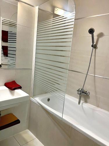 Denne leiligheten med klimaanlegg har 1 soverom, TV (flatskjerm), spiseplass, stue og kjøkken med kjøleskap. Håndklær og sengetøy finnes tilgjengelig i leiligheten.