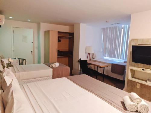 Modern and spacious, rooms at Pousada Guanabara Garden feature a balcony, LCD TV, fan and minibar. The private bathroom includes a shower. Room service is available until 14:00.