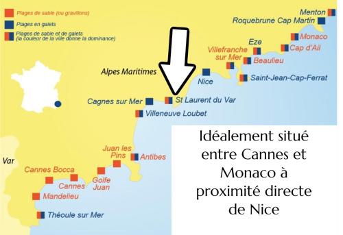 Odległość ważnych miejsc od obiektu: Sobór św. Mikołaja – 8,1 km, Dworzec kolejowy Nice-Ville – 8,9 km. Lotnisko Lotnisko Nicea-Lazurowe Wybrzeże znajduje się 2 km od obiektu.