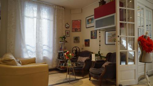 Guest rooms at Hotel des Dames are individually decorated to celebrate the lives of famous women. Each room include a small bathroom, a TV and a mini fridge.