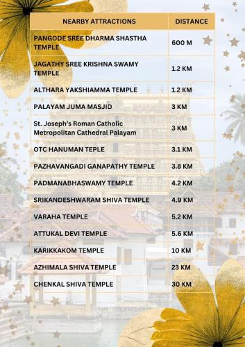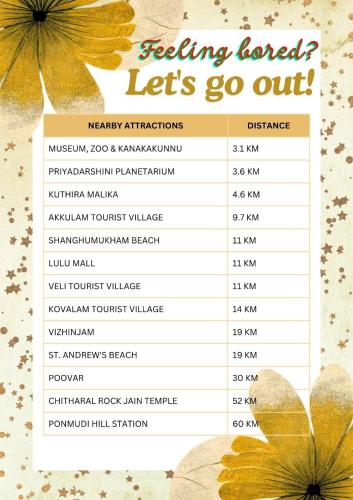 Odległość ważnych miejsc od obiektu: Kanakakunnu Palace – 1,7 km, Kerala Science and Technology Museum – 3,1 km. Lotnisko Lotnisko Thiruvananthapuram znajduje się 7 km od obiektu.