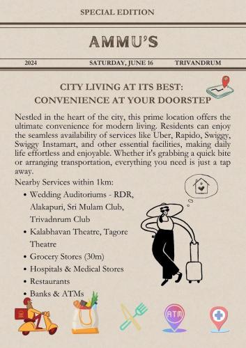 Obiekt Ammu's Homestay położony jest w miejscowości Thiruvananthapuram i oferuje klimatyzację. Odległość ważnych miejsc od obiektu: Napier Museum – 1,8 km, Świątynia Padmanabhaswamy – 5,6 km. Goście mogą korzystać z bezpłatnego WiFi we wszystkich pomieszczeniach. Na terenie obiektu znajduje się też prywatny parking.