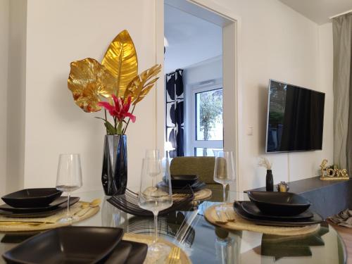 W apartamencie do dyspozycji gości przygotowano taras, sypialnię (1), salon oraz kuchnię z doskonałym wyposażeniem. Goście mają do dyspozycji telewizor z płaskim ekranem.