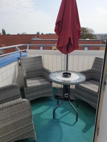 Obiekt Dachgeschoss Apartment mit Ausblick oferuje taras, balkon oraz widok na miasto. Odległość ważnych miejsc od obiektu: Sala koncertowa Georg-Friedrich-Haendel Hall – około 2,6 km. Na terenie obiektu dostępny jest prywatny parking.