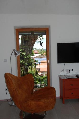 Oferta apartamentu obejmuje taras oraz salon z telewizorem z płaskim ekranem. Wyposażenie aneksu kuchennego obejmuje lodówkę, zmywarkę, piekarnik, a także ekspres do kawy i czajnik.