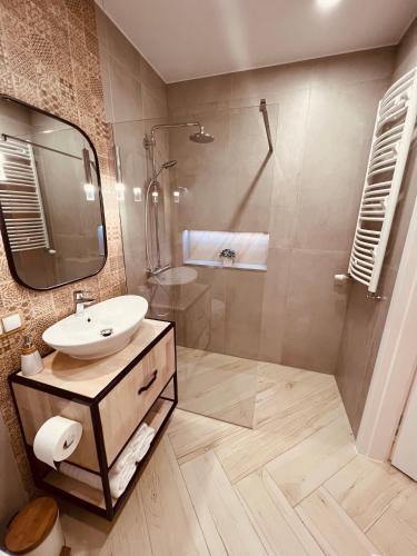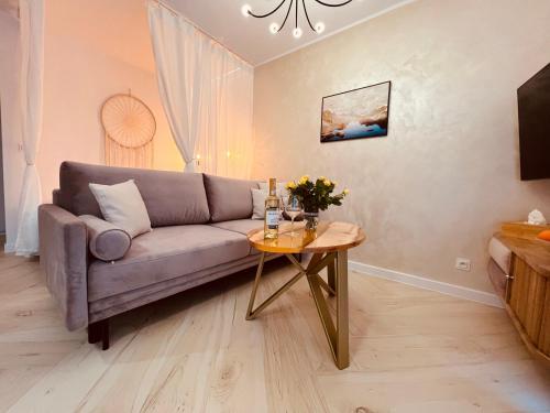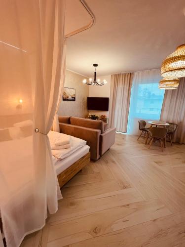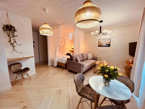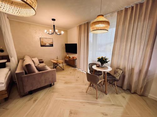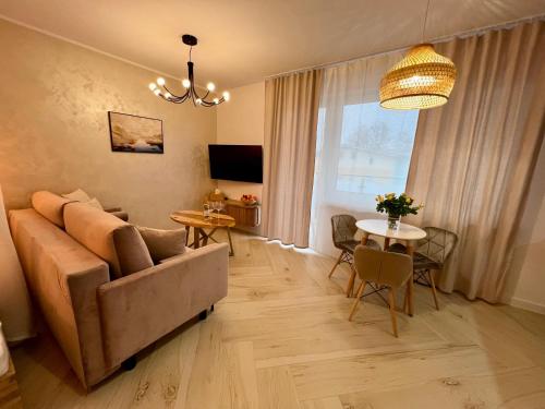 Oferta apartamentu obejmuje sypialnię (1), salon, kuchnię z pełnym wyposażeniem, w tym lodówką i ekspresem do kawy, a także łazienkę (1) z prysznicem oraz suszarką do włosów. W apartamencie zapewniono ręczniki i pościel.