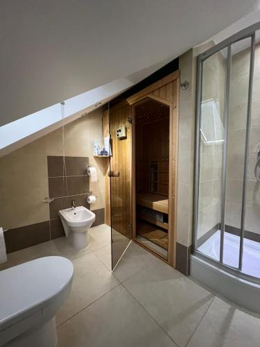 Zaplecze odnowy biologicznej obiektu Willa Kalinowe Pole obejmuje saunę i wannę z hydromasażem.
