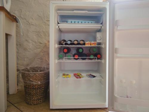 Wyposażenie obejmuje również lodówkę i czajnik.