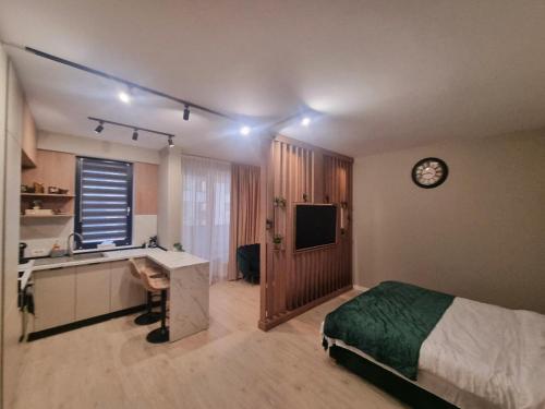 Oferta apartamentu obejmuje sypialnię (1), telewizor z płaskim ekranem oraz klimatyzację. Na miejscu znajduje się kuchnia.