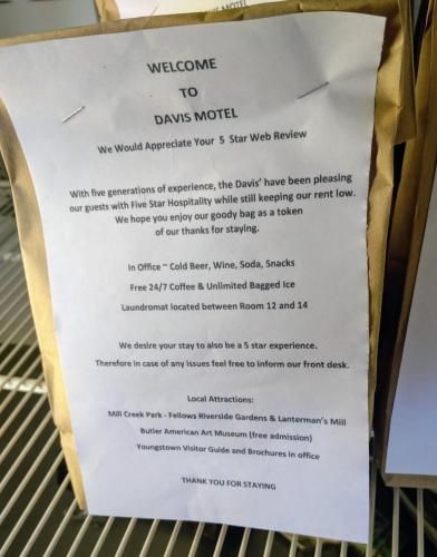 Each room at the Davis Motel features cable TV, a microwave, and a refrigerator. The simply decorated rooms have an en suite bathroom.