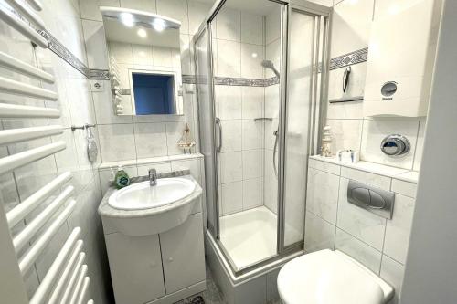 Providenciando uma varanda com vista do mar, este apartamento também apresenta uma televisão por cabo, uma cozinha equipada com um frigorífico, uma máquina de lavar louça e um micro-ondas, assim como 1 casa de banho com chuveiro e um secador de cabelo.