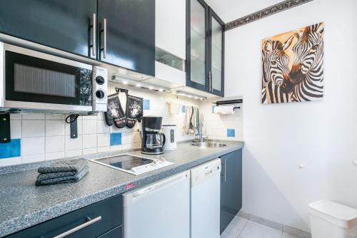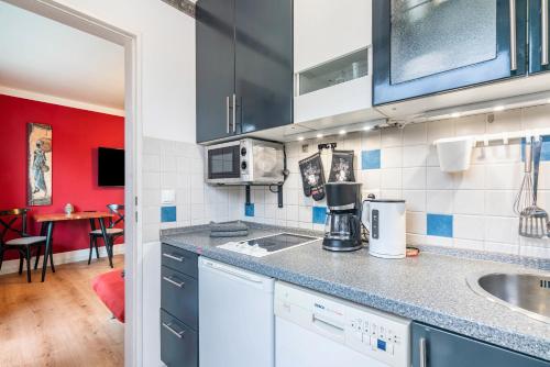 Este apartamento tem uma televisão. A cozinha apresenta um frigorífico, uma máquina de lavar louça e um micro-ondas, e há chuveiro com produtos de higiene pessoal gratuitos e um secador de cabelo.
