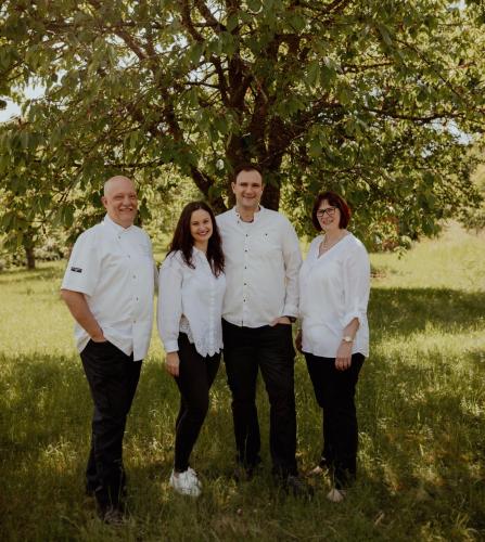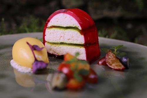 São servidos pratos locais e sazonais ao almoço e ao jantar no restaurante. O menu também inclui bolos e produtos de pastelaria caseiros.