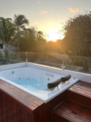 Apartamento cozzy possui uma banheira de hidromassagem.