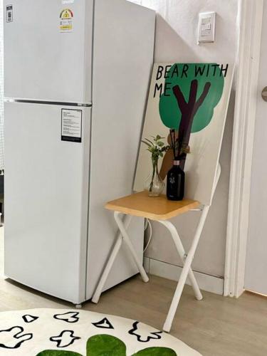 Este apartamento com ar condicionado tem 1 quarto, uma televisão de ecrã plano, uma área de refeições e uma cozinha com frigorífico e micro-ondas.