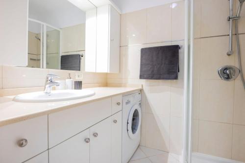 Este apartamento tem uma televisão. A cozinha inclui um frigorífico, um micro-ondas e uma torradeira, assim como máquina de café e chaleira.