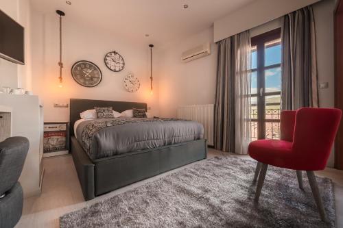 Construído com pedra e madeira, o Hotel Filoxenia inclui um salão com lareira, um restaurante, um bar e uma sala de conferências.