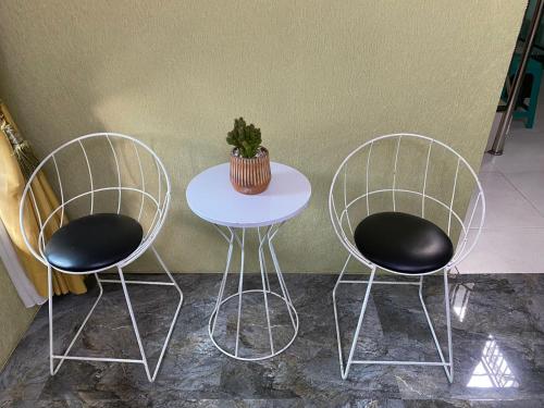 Também há uma área de refeições e uma cozinha com um frigorífico.