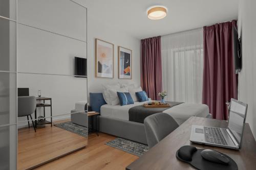 Apresentando vista da cidade, Mido Duo in New Building with Parking, Self Check-in and Security dispõe de acomodações com um jardim e varanda, a cerca de 2,5 km de Parque Herastrau. O alojamento fornece estacionamento privado gratuito, uma receção aberta 24 horas e acesso Wi-Fi gratuito.