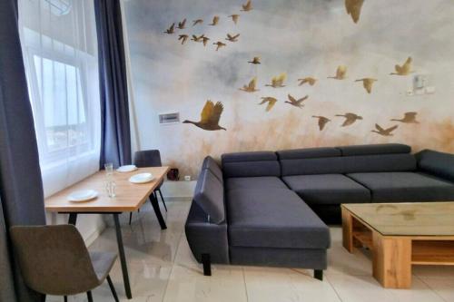 Este apartamento com ar condicionado tem 1 quarto, uma televisão de ecrã plano, uma área de refeições, uma cozinha com frigorífico e uma sala de estar.