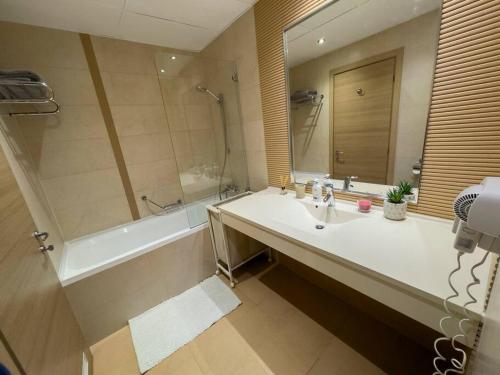The air-conditioned apartment consists of 2 bedrooms, a living room, a fully equipped kitchen with an oven and a coffee machine, and 2 bathrooms with a walk-in shower and a hot tub. Towels and bed linen are offered in the apartment. There is also a seating area and a fireplace.