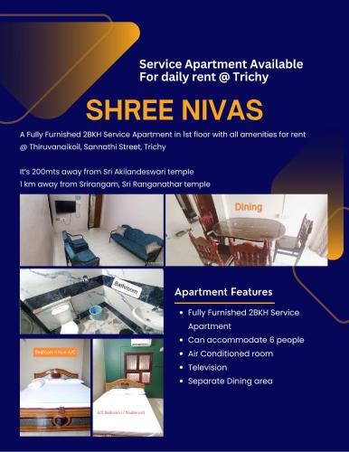 Ubytovanie Shree Nivas sa nachádza v destinácii Tiruchchirāppalli 1,9 km od miesta Chrám Sri Ranganathaswamy a 6 min. chôdze od miesta Jambukeswarar Temple. K dispozícii tu je bezplatné Wi-Fi a TV s plochou obrazovkou. Tento apartmán sa nachádza 3 km od miesta Autobusová stanica Chatram a 3,7 km od miesta Rockfort Trichy.