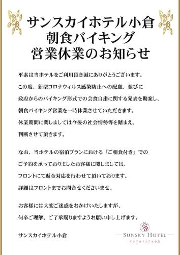 The air-conditioned rooms at Sunsky Hotel Kokura have a simple modern style and include a fridge and an electric kettle. Toiletries are provided.