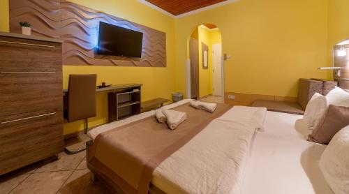Každá izba v ubytovaní Márvány Panzió má klimatizáciu, písací stôl, TV s plochou obrazovkou, patio s výhľadom na mesto a súkromnú kúpeľňu. Súčasťou vybavenia sú aj uteráky a posteľná bielizeň. V izbách ubytovania Márvány Panzió je k dispozícii súkromná kúpeľňa so sprchou a sušičom vlasov a majú tiež výhľad na záhradu. Všetky izby majú chladničku.