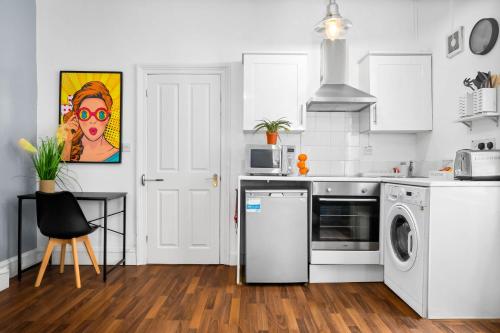 Ubytovanie Luxury Apartment - Fast WiFi - Wolverhampton 9aPC má spálňu (1), kúpeľňu (1) s bezplatnými toaletnými potrebami, obývaciu izbu a kuchyňu s chladničkou.