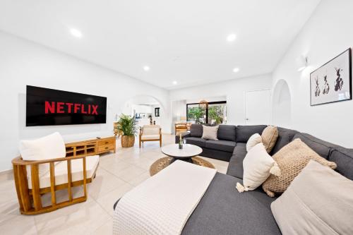 Boca Beach House NEW LUX 6 Bed 6 Bath Pool Walk To Beach har en utomhuspool, en trädgård och en egen strand och erbjuder boende i Palm-Eagle Beach med gratis WiFi och utsikt över trädgården. Denna villa erbjuder gratis privat parkering och ligger i ett område där du kan ägna dig åt aktiviteter som vandring, snorkling och bordtennis.