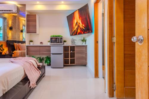 Lägenhet har 1 terrass och 1 sovrum. Här finns en platt-tv.