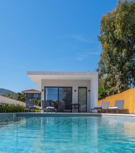 MERCURY VILLA - Minimal Luxury with Private Pool ligger i Panayía Mesosporítissa och erbjuder boende med en egen pool, utsikt över trädgården och en terrass. Det här luftkonditionerade boendet ligger 2,2 km från Agios Panteleimon strand och erbjuder privat parkering på plats och gratis WiFi.