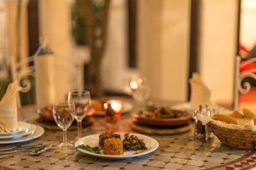 Nasreens restaurang serverar traditionell marockansk mat. Du kan äta i matsalen eller på innergården som är fylld med växter och blommor.